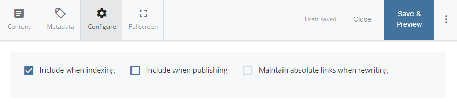 - At the top of the popup, select the 'Configure’ tab. Un-check the ‘Include when publishing’ option. This prevents the page from getting published if/when you do a full-site publish. This is an important step since CMU site administrators may occasionally need to publish the entire CMU website. If this option is checked, your page will get published again.